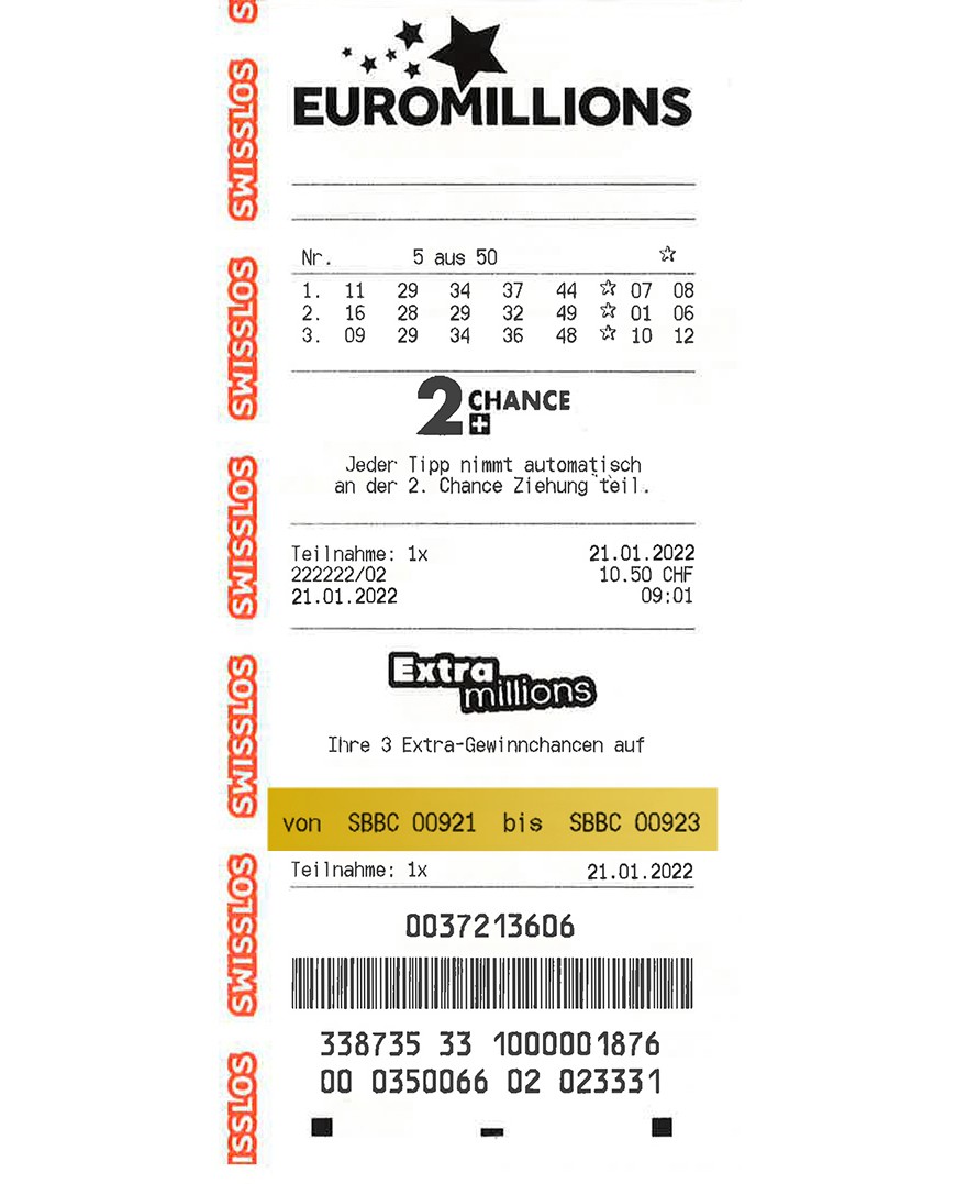 Bei der Ziehung vom 21. Januar 2022 werden aus allen Teilnahmecodes 100 Gewinner oder Gewinnerinnen gezogen. Die Glückspilze, welche einen der 100 Gewinncodes auf Ihrer Spielquittung finden, werden um 1 Million* reicher. Die gezogenen Gewinncodes werden bei den EuroMillions Gewinnzahlen auf der Internetseite von Swisslos veröffentlicht.