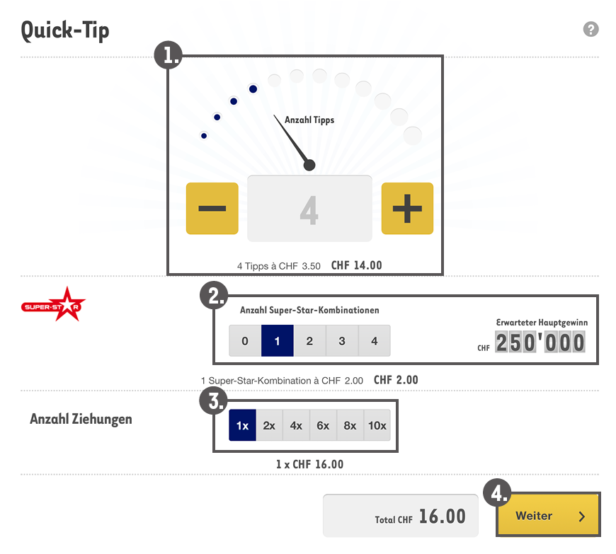 1. Wie viele Tipps Sie spielen wollen. Sie erhalten zufällig ausgewählte Zahlen zugeteilt. Über die beiden Schaltflächen „+“ / „-“ können Sie die gewünschte Anzahl an Tipps einstellen.