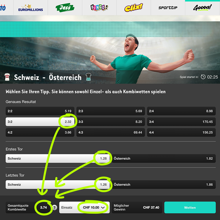 • Bei jedem Spiel können Sie auf Folgendes wetten: Das genaue Endresultat, welche Mannschaft das erste und welche das letzte Tor schiessen wird.