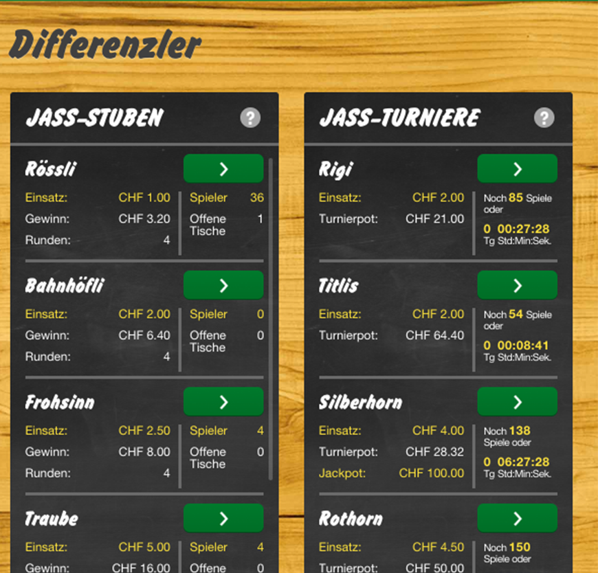 Bei Differenzler können Sie an Jass-Turnieren teilnehmen, bei denen Sie um den Turnier-Pot und allenfalls um den Jackpot jassen. Das von Ihnen erzielte Spielresultat und die Spielresultate der anderen Turnierteilnehmer werden in der Turnierrangliste erfasst.