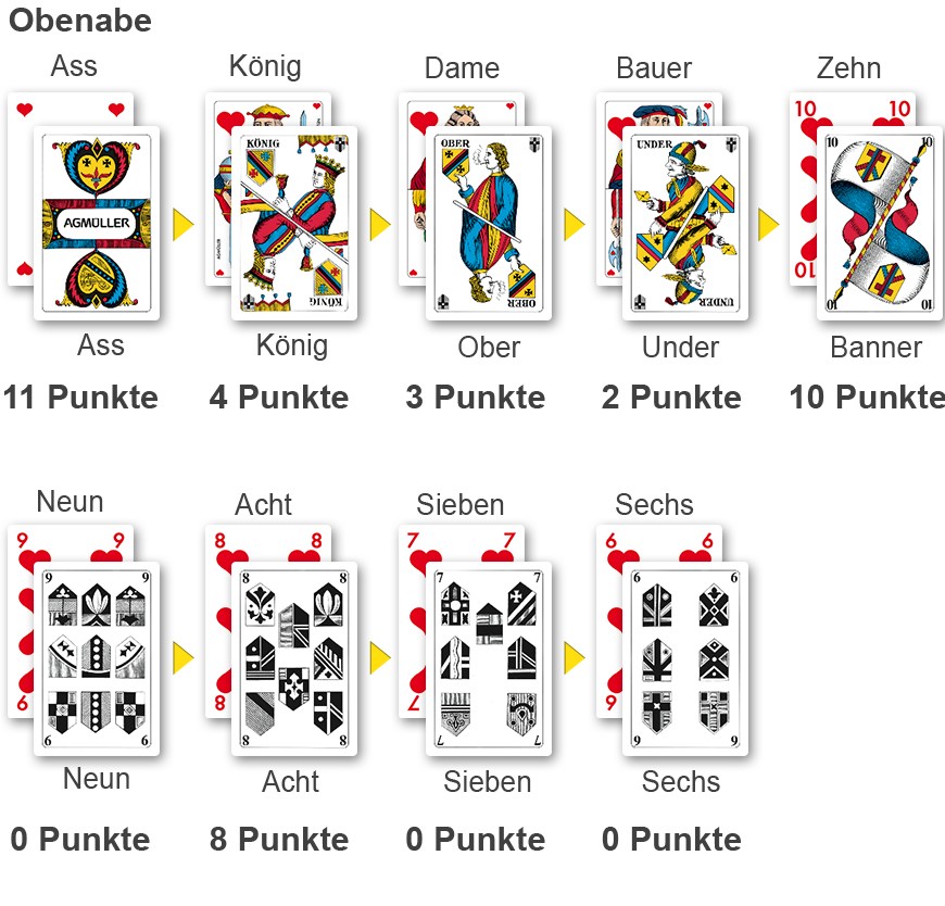 Beim Obenabe und Undenufe gibt es keine Trumpffarbe. Die Rangfolge sowie die Punktwerte gelten gemäss der nebenstehenden Abbildung. Beim Obenabe ist das Ass die höchste Stechkarte. Beim Undenufe ist hingegen die 6 die stärkste Stechkarte. Auch beim Obenabe und Undenufe gilt, dass eine höhere Karte eine tiefere Karte sticht.