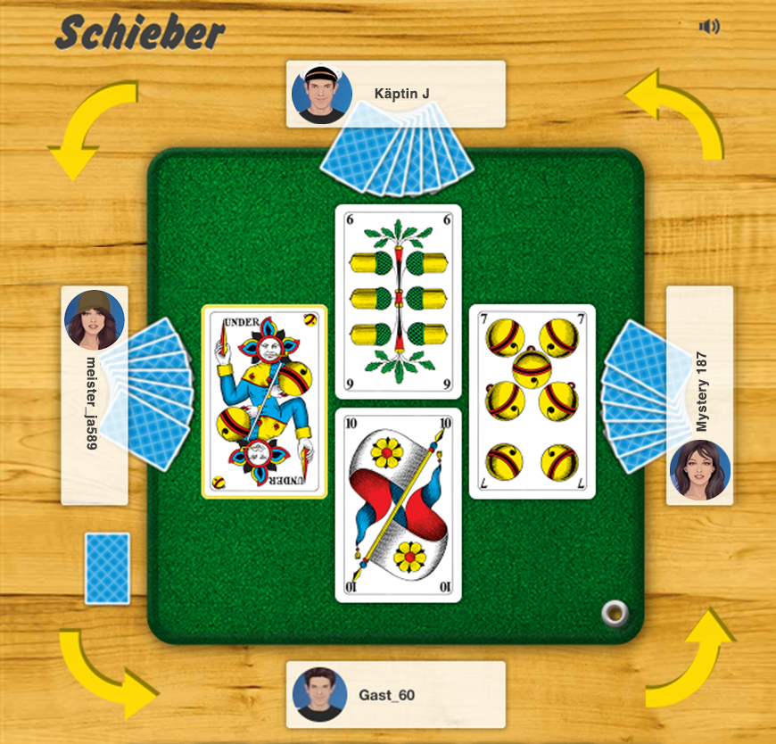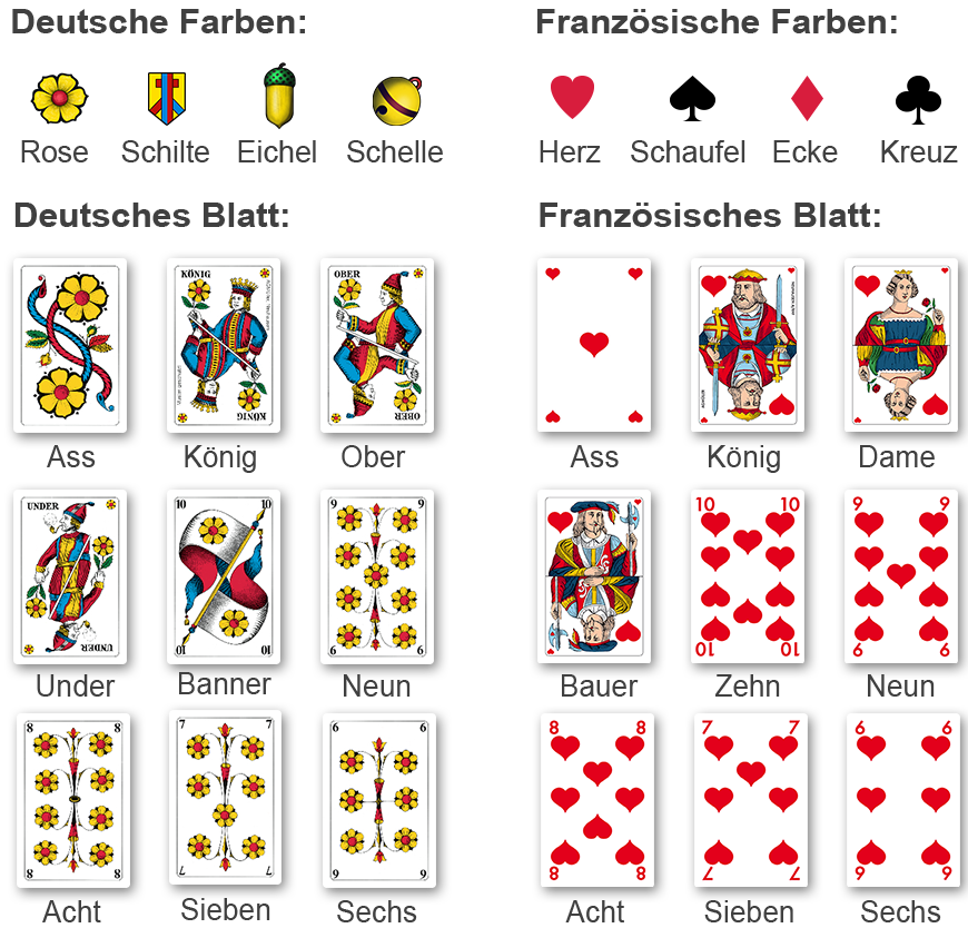 Sie können zwischen einem Kartenset mit deutschen Farben (deutsches Blatt) und einem Kartenset mit französischen Farben (französisches Blatt) wählen.