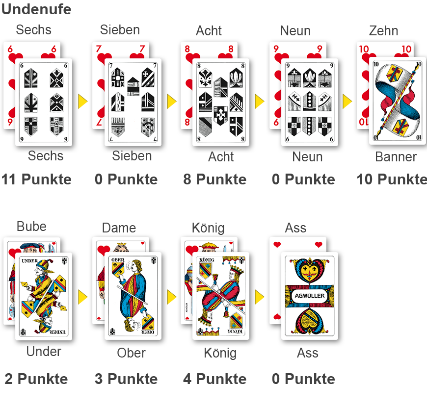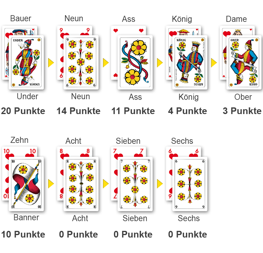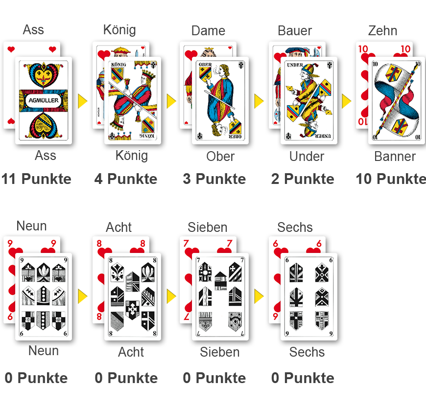 Die Rangfolge innerhalb der Nebenfarben sowie die Punktwerte gelten gemäss der nebenstehenden Abbildung. Eine höhere Karte sticht eine tiefere Karte.