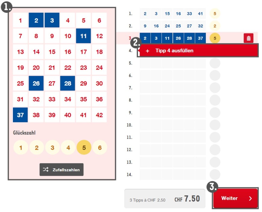 Klicken Sie auf „Zufallszahlen“ und der Tipp wird automatisch mit zufällig gewählten Zahlen ausgefüllt.
