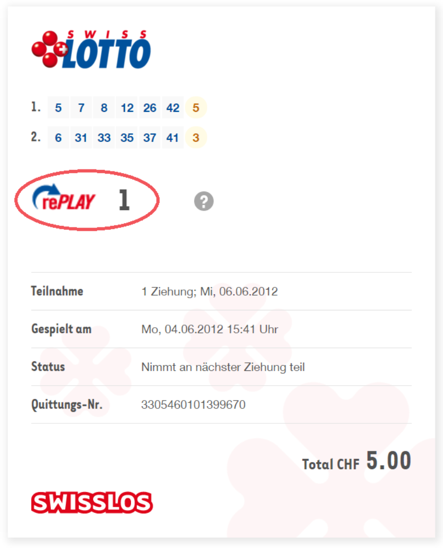 Auf jede Spielquittung wird zufällig eine Replay-Zahl zwischen 1 und 13 aufgedruckt. Stimmt Ihre Replay-Zahl mit der ermittelten Gewinnzahl überein, gewinnen Sie kostenlos eine erneute Teilnahme bei Swiss Lotto in der Höhe Ihres geleisteten Spieleinsatzes.