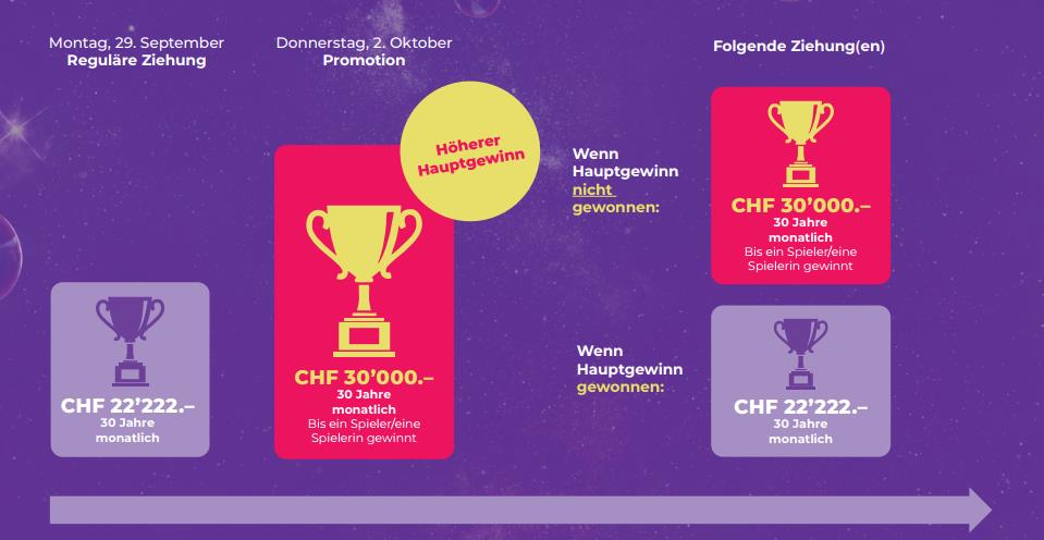 The higher main prize of 30,000 francs will remain in place from October 2 until it is won. Afterwards, the main prize will return to the regular amount of 22,222 francs per month for 30 years.