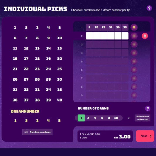 With individual picks, you choose your numbers and dream number yourself for each pick. A pick costs 3 francs. You can select between 1 and 15 picks.