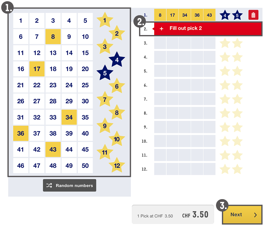 1. In the entry field, choose the numbers for your first EuroMillions pick. A pick always consists of 5 numbers (1-50) and 2 stars (1-12).