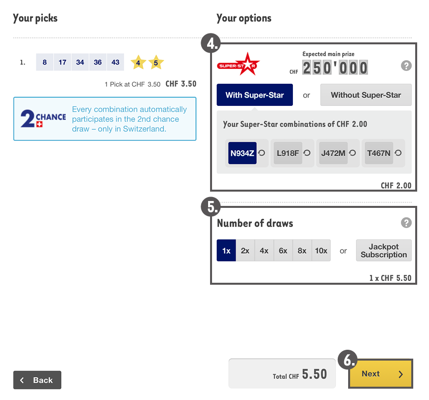 4. Choose whether you want to play EuroMillions with or without Super-Star. You can play up to four Super-Star combinations. Each Super-Star combination costs CHF 2.00.