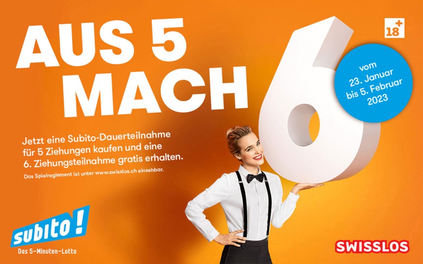 Make the most of an attractive special offer from 23 January to 5 February 2023, thanks to the new «Subito» with subscription plays. For every purchase of a «Subito» subscription play with 5 draws, you get a 6th draw completely free. So even more chances to win!