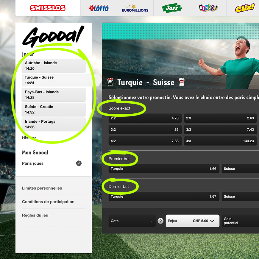 De A comme attaquant à Z comme zlataner – les matches de football virtuels de Swisslos vont combler tous les amoureux du ballon rond. Et même plus encore! À Goooal, vous ne jouez pas seulement pour la galerie mais bien pour engranger 24 heures sur 24 de beaux gains! Toutes les quatre minutes démarre un nouveau match. Vous avez la possibilité de parier sur le résultat exact, sur l’équipe qui marque le premier but et sur l’équipe qui marque le dernier but. Un clip réunit les meilleures séquences du match. Vibrez intensément, et soyez prêt à remporter votre pari.