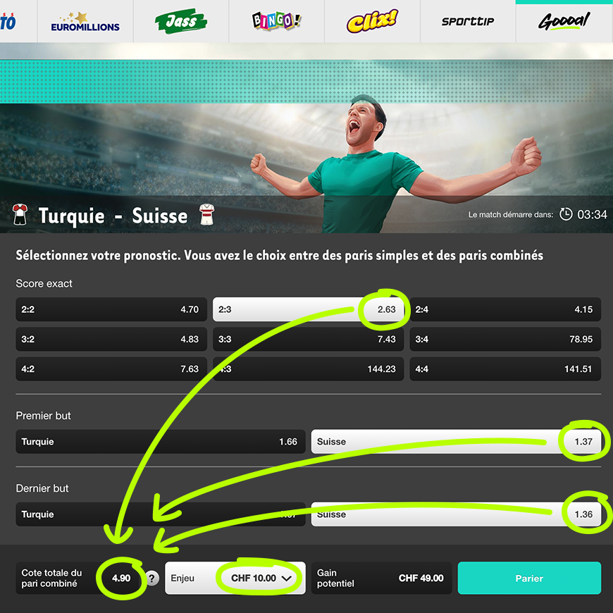 - Les paris possibles sur chaque match sont: le résultat final exact, l’équipe qui inscrit le premier but, l’équipe qui inscrit le dernier but.