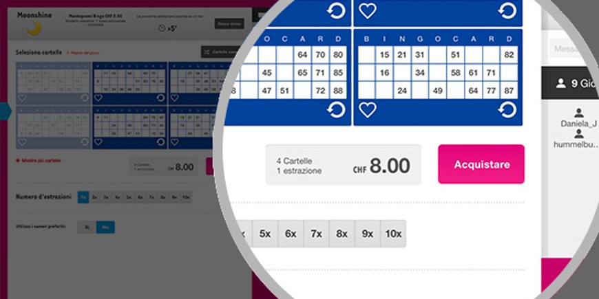 I prodotti Bingo di Swisslos vengono offerti in modalità multigiocatore e dispongono sempre di una chat. Su Internet “chat” significa comunicare online in diretta con almeno due partecipanti che si scambiano dei messaggi di testo.