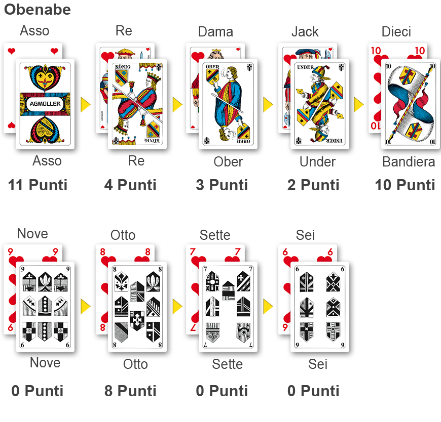 In caso di scelta di "obenabe" (dall'alto) o di "undenufe" (dal basso), il seme di briscola non c'è. L'ordine di presa nonché i punteggi sono indicati nell'illustrazione a lato. Con obenabe l'asse è la carta più alta, con undenufe, invece, la carta più forte è il 6. Anche per le formule obenabe e undenufe la carta più forte prende sulla carta più debole.