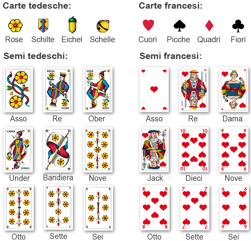 È possibile scegliere tra un mazzo di carte con semi tedeschi (mazzo tedesco) e un mazzo di carte con semi francesi (mazzo francese).