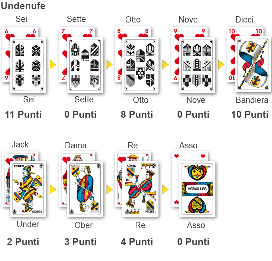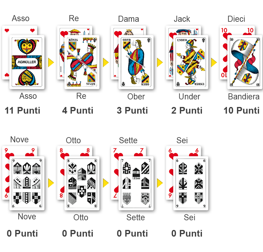 In questa pagina vengono spiegate le nozioni basilari dello jass: le carte da gioco, l’ordine di presa e il punteggio delle carte.